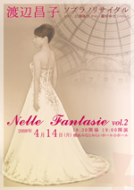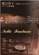 Nelle Fantasie vol.3 2010年2月5日(金) 横浜みなとみらいホール小ホール ピアノ:相田久美子 ナビゲーター:武田竹美 <主な曲目> ベッリーニ:オペラ「夢遊病の娘」より“もし、もう一度だけ彼に会えるのなら” ベッリーニ:オペラ「清教徒」より“あなたの優しい声が” トマ:オペラ「ハムレット」より“私も遊びの仲間にいれてください” 他